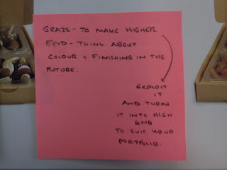 - Feedback was that the concept works well but must consider stock choices...how could I keep the materials sustainable yet water resistant. A solution to this could be that I propose the plastic graze tubs to be made out of biodegradable plastic. This is something I came across last module, a plastic which biodegrades in compost after a certain amount of time.
